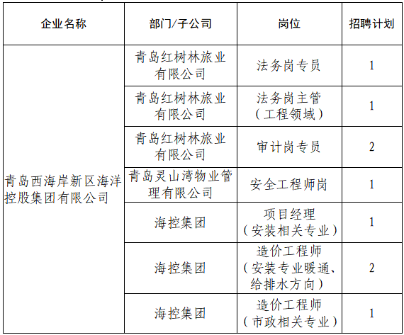 为满足集团业务发展需要,青岛西海岸新区海洋控股集团有限公司现面向社会公开招聘工作人员17名,具体招聘公告如下: